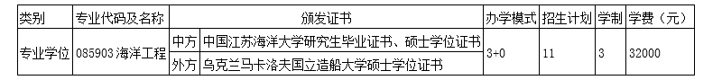 标准学制3年,由马卡洛夫国立造船大学与江苏海洋大学共同制定培养方案、组织教学,外方课程用英文授课,中方和外方双导师共同协作指导。全部授课及相关教学活动均在江苏海洋大学进行。江苏海洋大学马卡洛夫海洋工程学院学费标准依照国家有关政府定价规定确定。2024级硕士研究生学费为32000元/年。