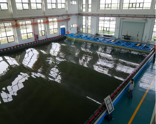 海洋工程技术研究中心于2017年建成投入使用,试验大厅总面积3500m2,总投资达4000万元。建设有50mX25mXlm大型船舶与海洋工程动力水池、30mX25mX5m海洋测量消声水池、70mX1.5mX1.8m大型玻璃水槽和直径2.5m环形波流水槽。