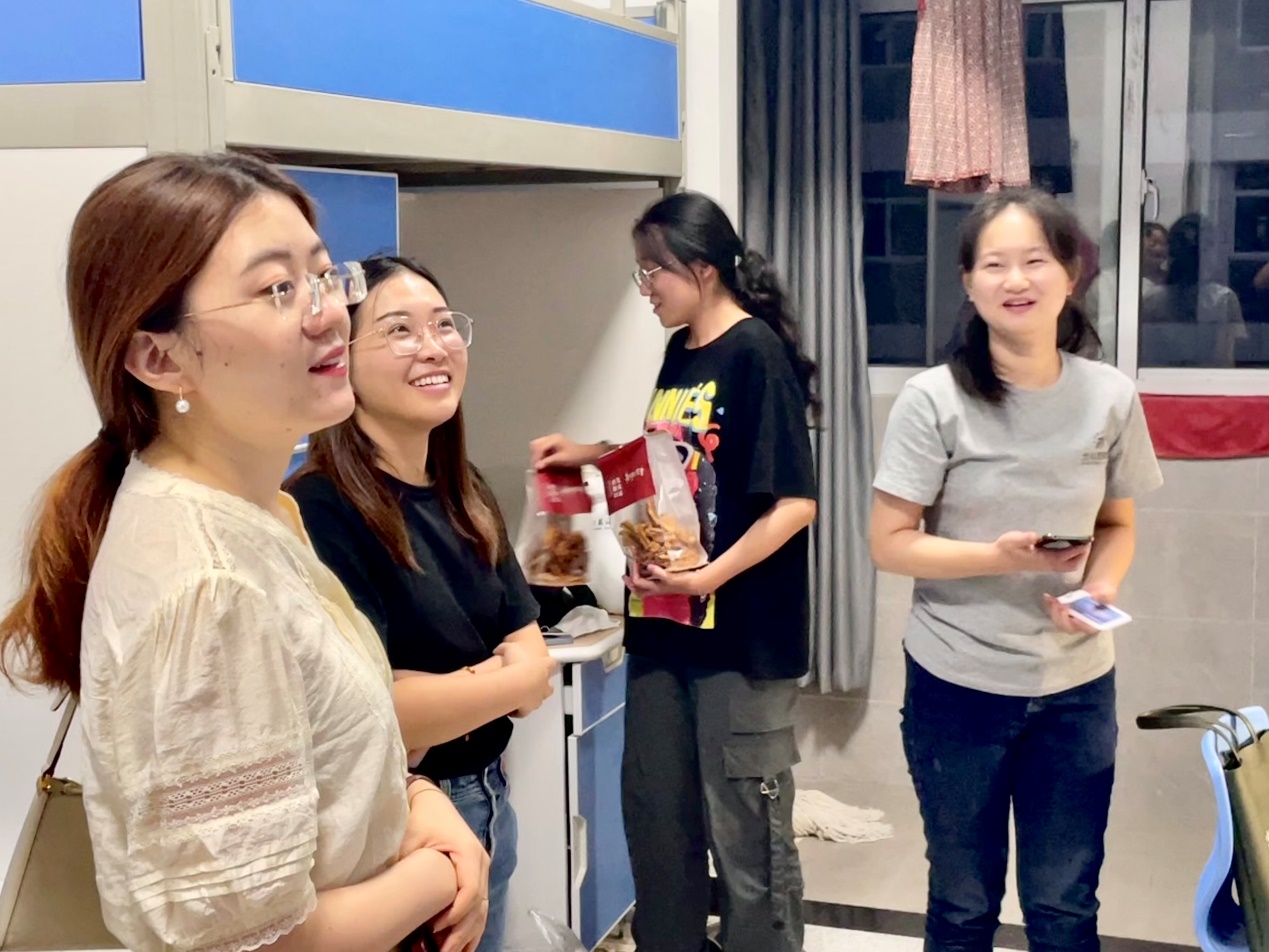 徐岚依次走访每个宿舍,首先亲切的对各位新生的到来表达欢迎,其次询问新生是否能适应宿舍环境,并亲自检查宿舍内部设施是否有故障或损坏,同时也嘱咐宿舍成员要和睦相处,互帮互助,积极向党组织靠拢,一起体验美好大学生活。刘葳兴亲切问候各位女生,勉励她们注重学业,全面发展。李俊伟表示宿舍成员要友好相处,共同提升。解长江勉励新生做好大学四年职业规划,努力提升专业知识水平。徐嘉婕真心关切学生,嘱咐学生好好相处,共同度过大学四年。祁明慧表示同学们如果有生活和学习上的问题可以第一时间联系自己,并叮嘱同学们在日常生活中要注意自身安全,多多参加学校文体活动。