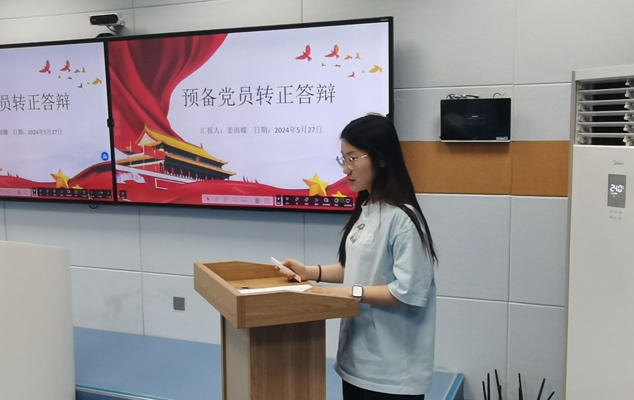 徐岚介绍了预备党员转正答辩流程,强调了工作纪律与答辩要求。答辩分为个人陈述、基础理论测试和综合素质考核三个环节。4名答辩人依次汇报了预备党员期间在政治理论学习、工作生活收获、模范作用发挥、完成党组织交给的任务、自身存在的问题及整改措施等方面的情况。答辩人现场随机抽取题目,完成有关党章、党史、党纪的理论问答考核。答辩评委在自由提问环节重点考察了预备党员对“切实履行党员义务”、“认真贯彻群众路线”、“弘扬伟大建党精神”、“树立正确入党动机”等方面的理解与思考。
