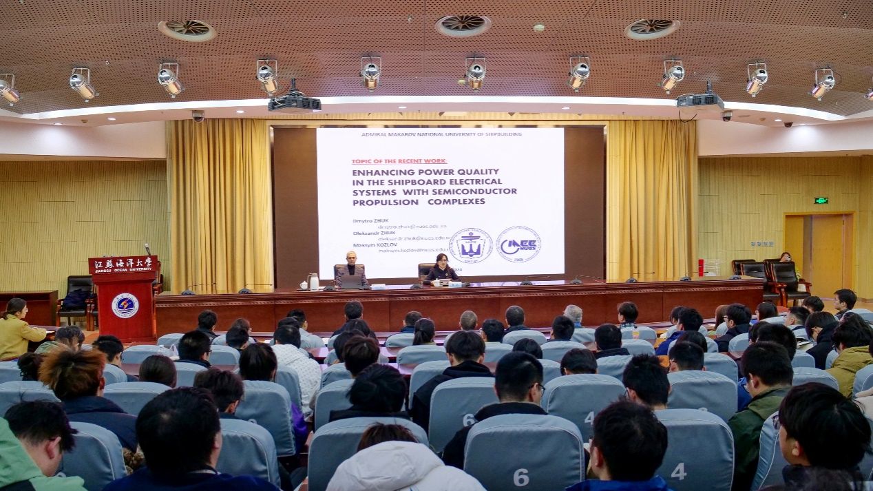 Dmitry Zhuk作题为“Enhancing Power Quality in the Shipboard Electrical Systems with Semiconductor Propulsion Complexes”报告,重点介绍了电能质量的稳定性和可靠性在船舶电力系统运行中的重要性,分析了增强电能质量保证工具以提高其效率的科研方向。Dmitry Zhuk教授分享了其研究团队如何充分考虑船舶电力系统集成,半导体推进复合体的电路设计,研制单极和双极两个版本的受控滤波器补偿装置及其在船舶及海洋模块钻机中的应用。学术报告结束后,师生们就该系统在“恶劣海况下的稳定性和可靠性”、“提升船舶动力系统中的表现”、“强电磁环境中的保护机制”等话题与Dmitry Zhuk教授进行了深入交流。