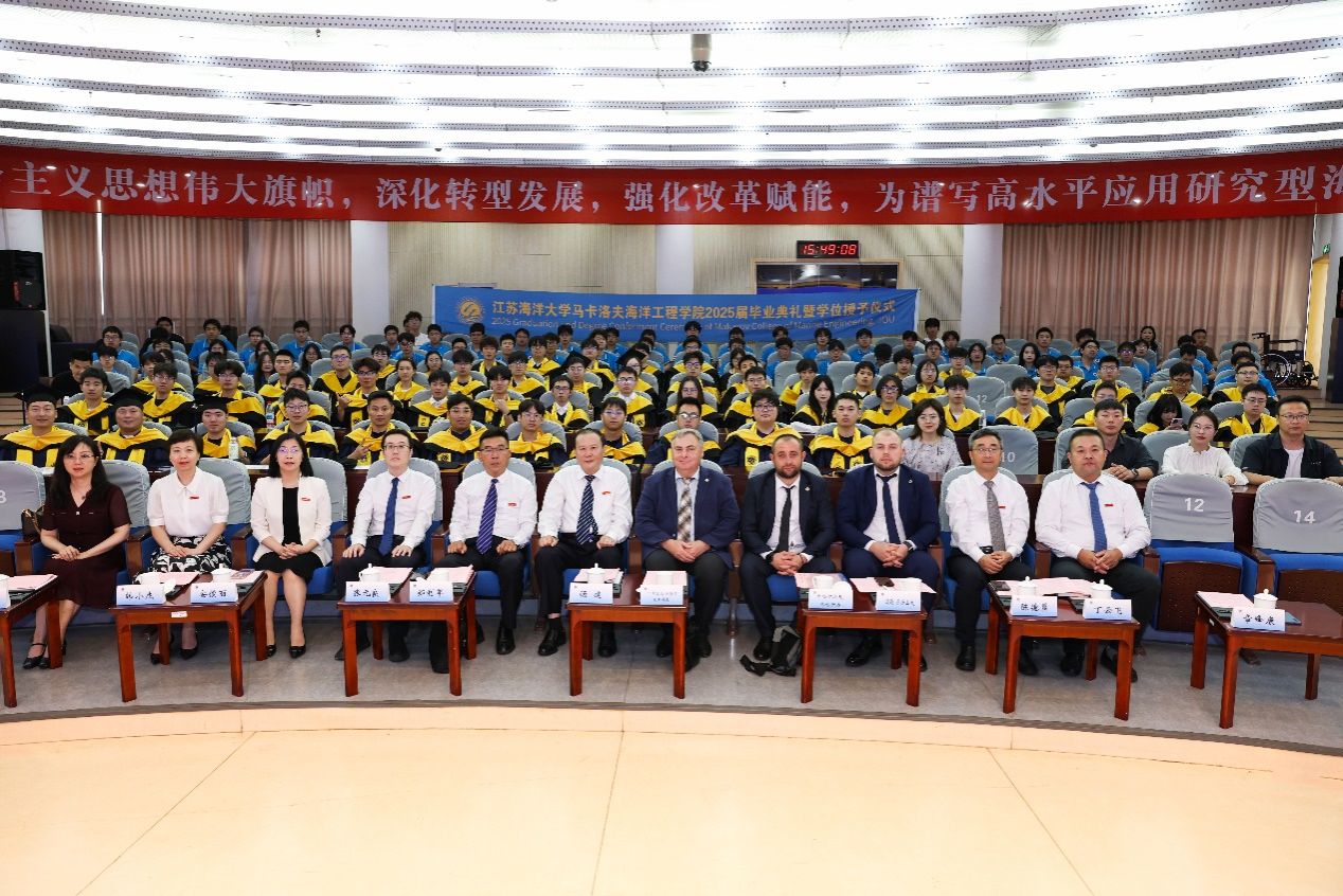 6月20日下午,江苏海洋大学马卡洛夫海洋工程学院首届学生毕业典礼暨学位授予仪式在会议中心黄海厅举行。江苏海洋大学校长汤建、副校长郑利军、副校长张元良、马卡洛夫国立造船大学校长Eugeniy Trushliakov、副校长Mykhailo Mykhailov出席典礼。马卡洛夫国立造船大学国际合作教育中心负责人,江苏海洋大学教务处、学生处、国际处负责人,专业学院负责人,马卡洛夫海洋工程学院全体教职工,2025届本科生、研究生和毕业生家长代表参加典礼。学院直属党支部书记章峰康主持毕业典礼和学位授予仪式。
