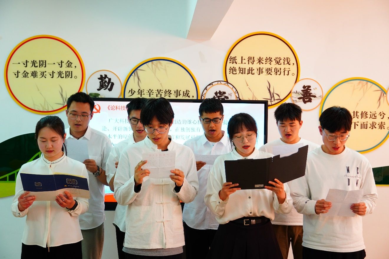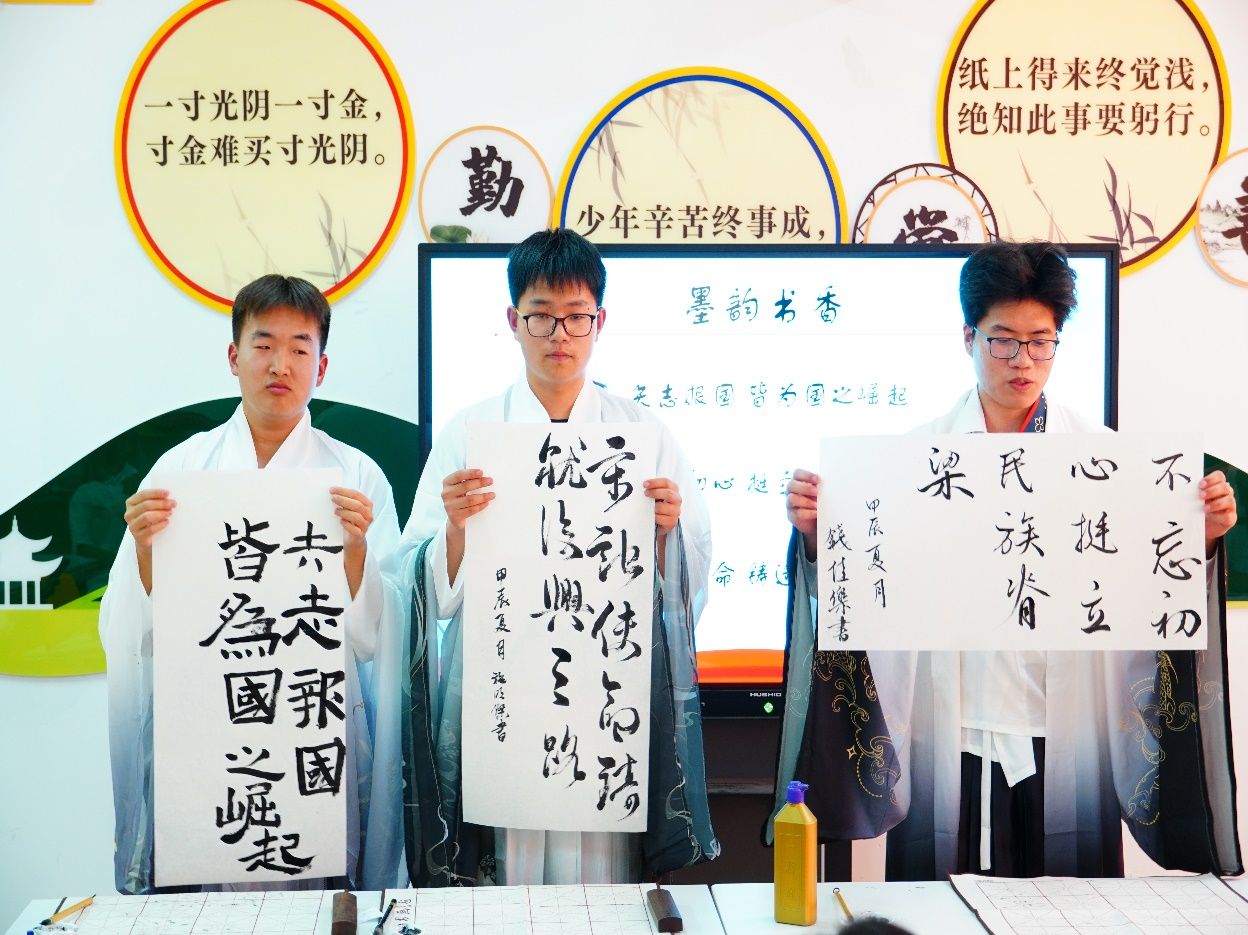 机器人2222班祝彬瑞领读《国之脊梁:中国科学家的家国天下》,重点介绍了钱学森、程开甲、孙家栋、袁隆平等先进人物的奋斗事迹和感人故事,鼓励同学们树立崇高的理想信念和强烈的家国意识,将个人发展与国家、民族的前途命运紧密相连,为实现中华民族伟大复兴的中国梦贡献自己的力量。钱佳乐、施小龙、施明杰三位同学挥洒笔墨,以隶书、楷书、行书三种不同字体书写了“矢志报国 皆为国之崛起”、“不忘初心 挺立民族脊梁”、“牢记使命 铸造复兴之路”,激发了全体师生的家国情怀,感受到催人奋进的社会责任感和历史使命感。