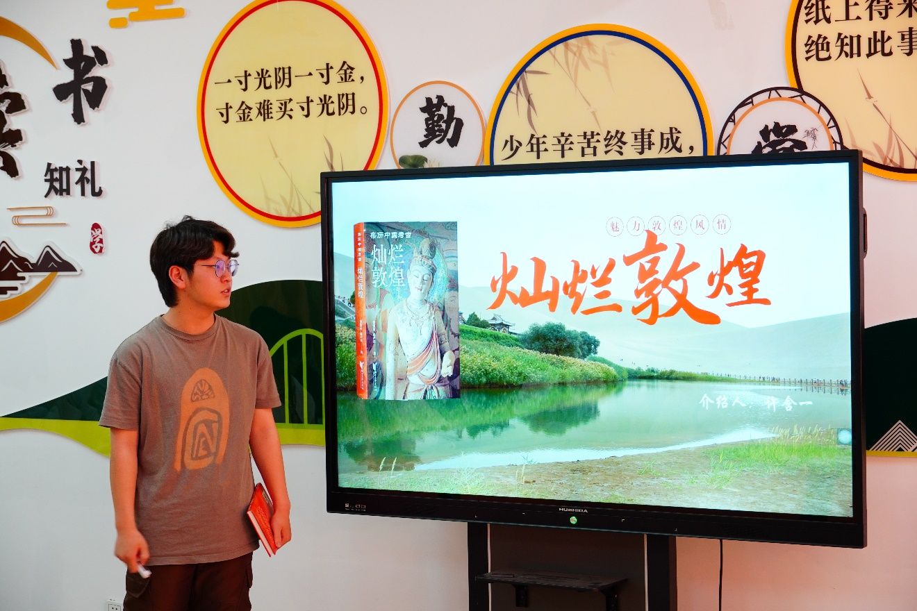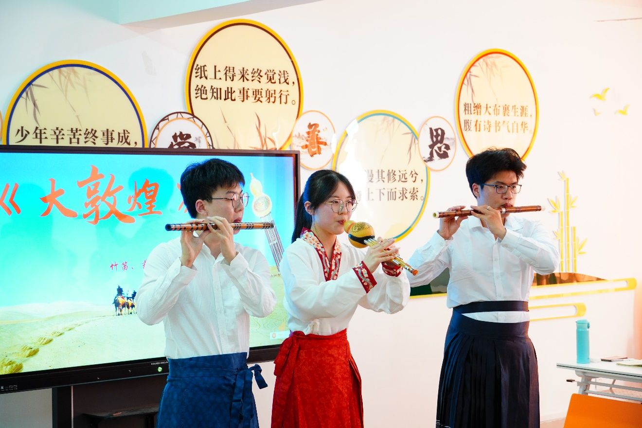船舶2234班许含一带领同学们领略《灿烂敦煌》之美,这是一部深入挖掘敦煌文化底蕴的杰作,以生动的笔触和丰富的插图,淋漓尽致展现敦煌辉煌历史和灿烂文明,更传递了敦煌文化的独特魅力和人文精神,帮助在场师生了解到敦煌的历史和文化,以及在“一带一路”的时代背景下,敦煌所积极倡导的丝路精神。毛润扬、陈涨、钱佳乐三位同学以竹笛、葫芦丝等器乐演奏《大敦煌》,以优美的旋律携在场师生穿越时空,沉浸式体验敦煌的辉煌与神秘。