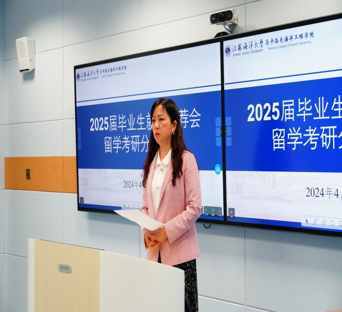 为落实党中央、国务院“稳就业”“保就业”决策部署,全面做好2025届毕业生就业准备工作,进一步帮助学生明确就业目标,马卡洛夫海洋工程学院于2024年4月29日在文华楼606活动室召开2025届毕业生出国留学与考研分享交流会。外国语学院刘娟教授、海洋工程学院和机械工程学院考研成功学生代表、辅导员徐嘉婕及2025届全体毕业生参加会议,会议由院直属党支部书记、常务副院长徐岚主持。