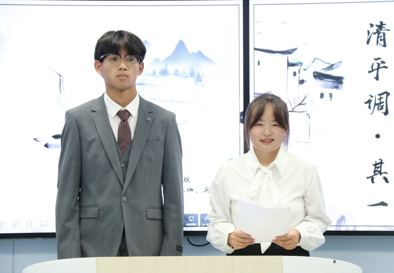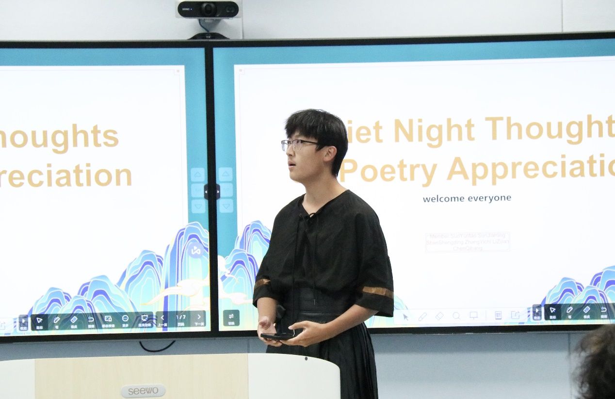 五组学生分别上台通过将英文与诗歌相结合的方式,巧妙连接古今中外。一首李白的《清平调》拉开了交流会的序幕,学生通过英文详细解说诗歌的意向、创作背景、主旨大意,带领现场师生领略了中国古典诗歌的魅力,丰富对中国传统文化的理解。
