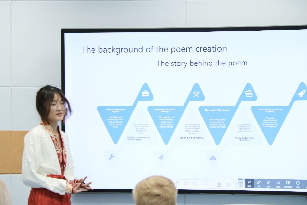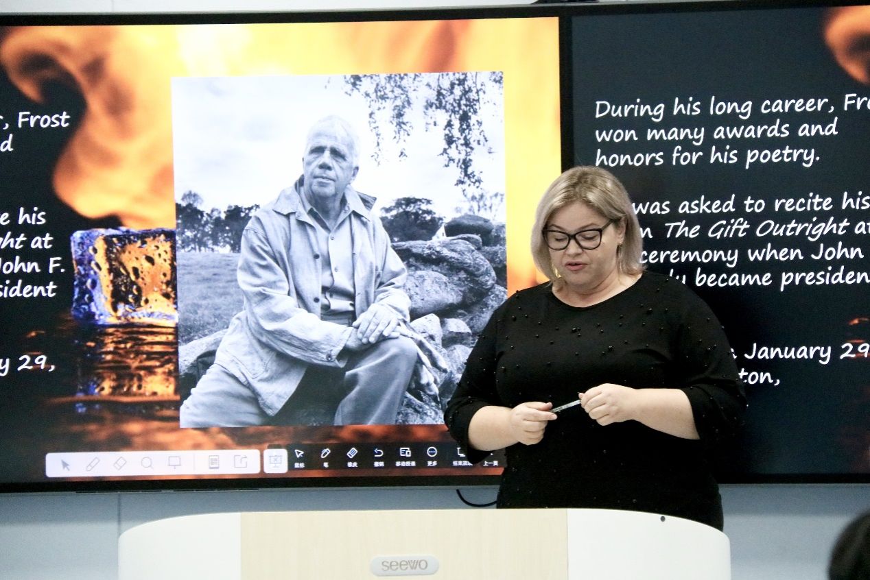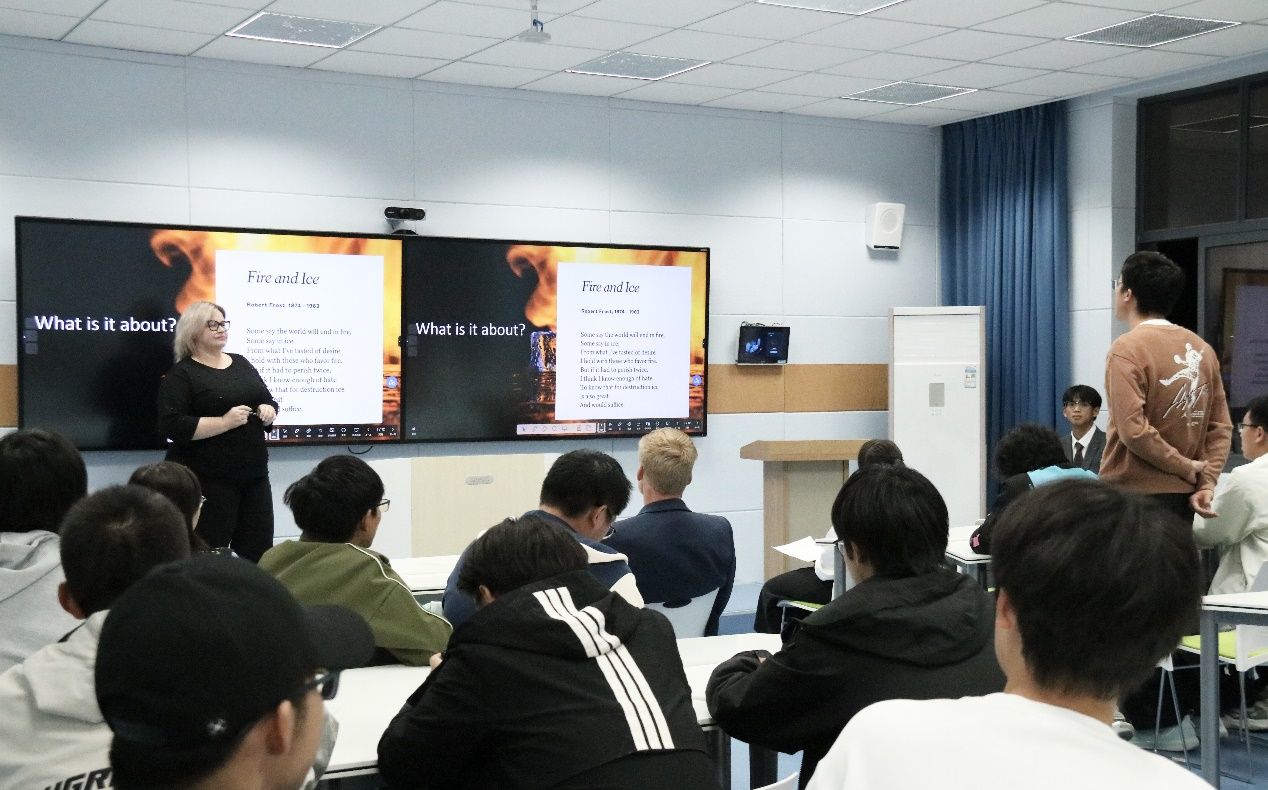 外教Raymond分享了诗歌《在佛兰德丝战场》,用深情的朗诵表达了深沉的情感、战争的无情与残酷以及诗人对和平的深切呼唤,深深触动了同学们的心。外教Alina分享了诗歌《火与冰》,介绍了诗歌的作者生平。在互动环节,她对每位分享者的表现都给予了高度评价,并提出了专业的建议。