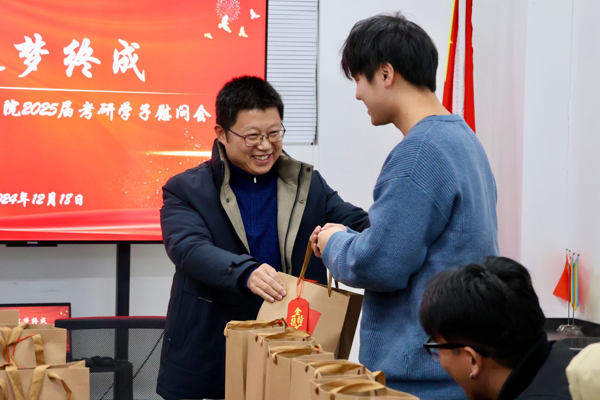 章峰康亲切的鼓励大家,在冲刺的最后阶段,要照顾好自己的身体和心情,以最佳状态迎接考试。他结合学院准备的考研慰问大礼包,给学子们送上祝福,香蕉是交好运、苹果是考试过程平安喜乐、橙子结果心想事成、薯愿是一切如愿、暖宝宝是学院作为考研学子的坚强后盾,会温暖陪伴同学们决胜考场。