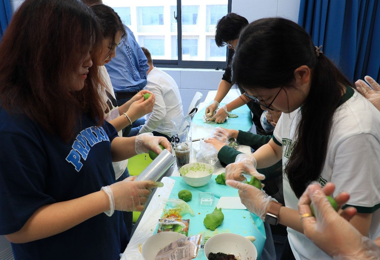 活动伊始,学生代表以图文并茂的形式,生动阐释了清明节的起源、扫墓祭祖的礼俗及踏青的文化意涵,外籍教师也分享了他们国家祭奠祖先的传统。青团制作区墨香与艾草清香交织,翠绿的汁液融入糯米粉,包裹着豆沙、咸蛋黄等馅料,师生们揉面塑形,谈笑间传递着不同国家的饮食文化记忆。投壶竞技场,竹矢破空的清脆声响此起彼伏。这项源自战国礼射的雅戏,在参与者屏息凝神的投掷中化作文化密码的破译现场。师生们或屏息瞄准,或欢呼击掌,跨文化交流的热络气息充盈空间。活动尾声,众人执柳踏青,漫步于花朵盛开的校园。