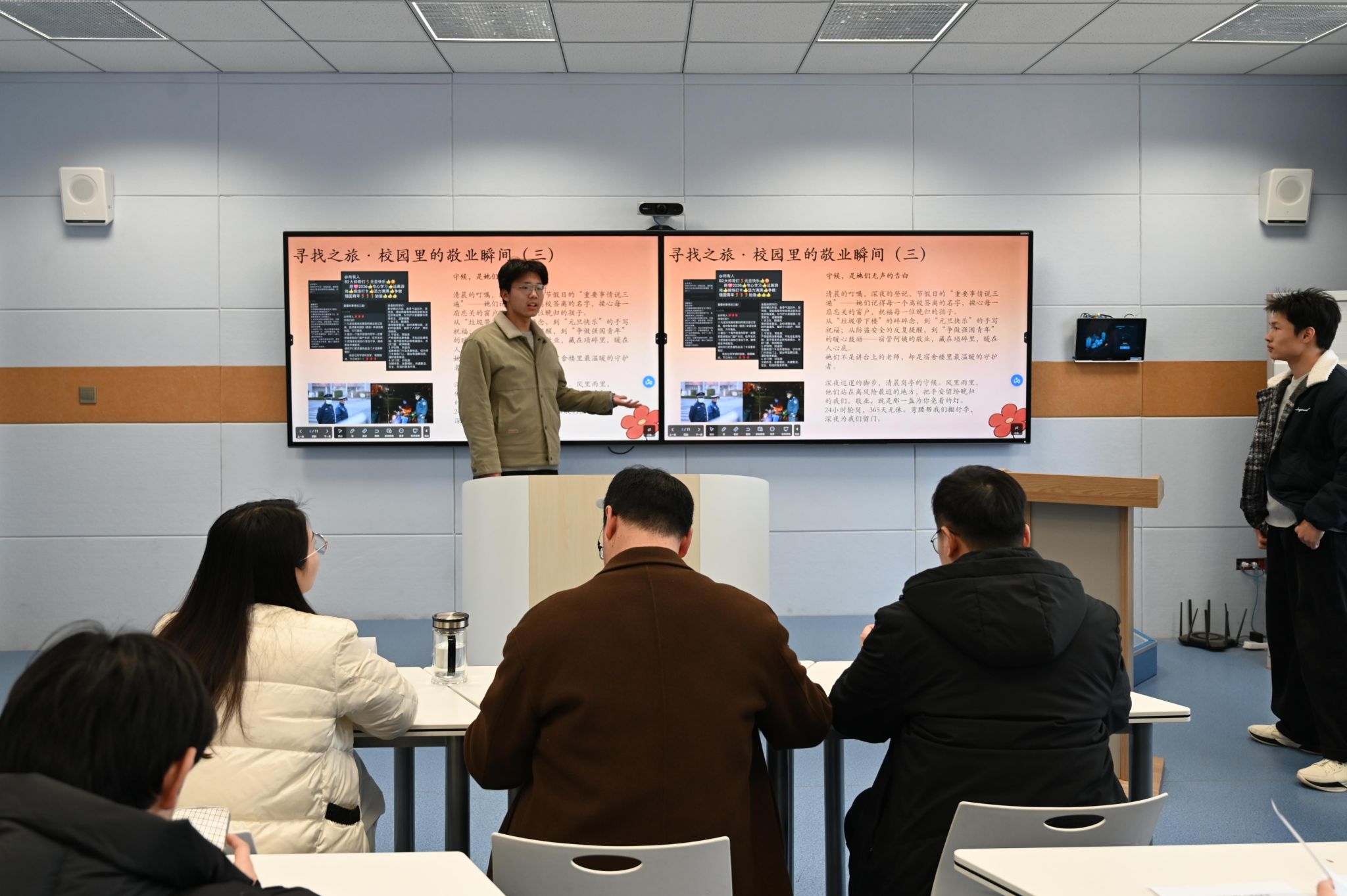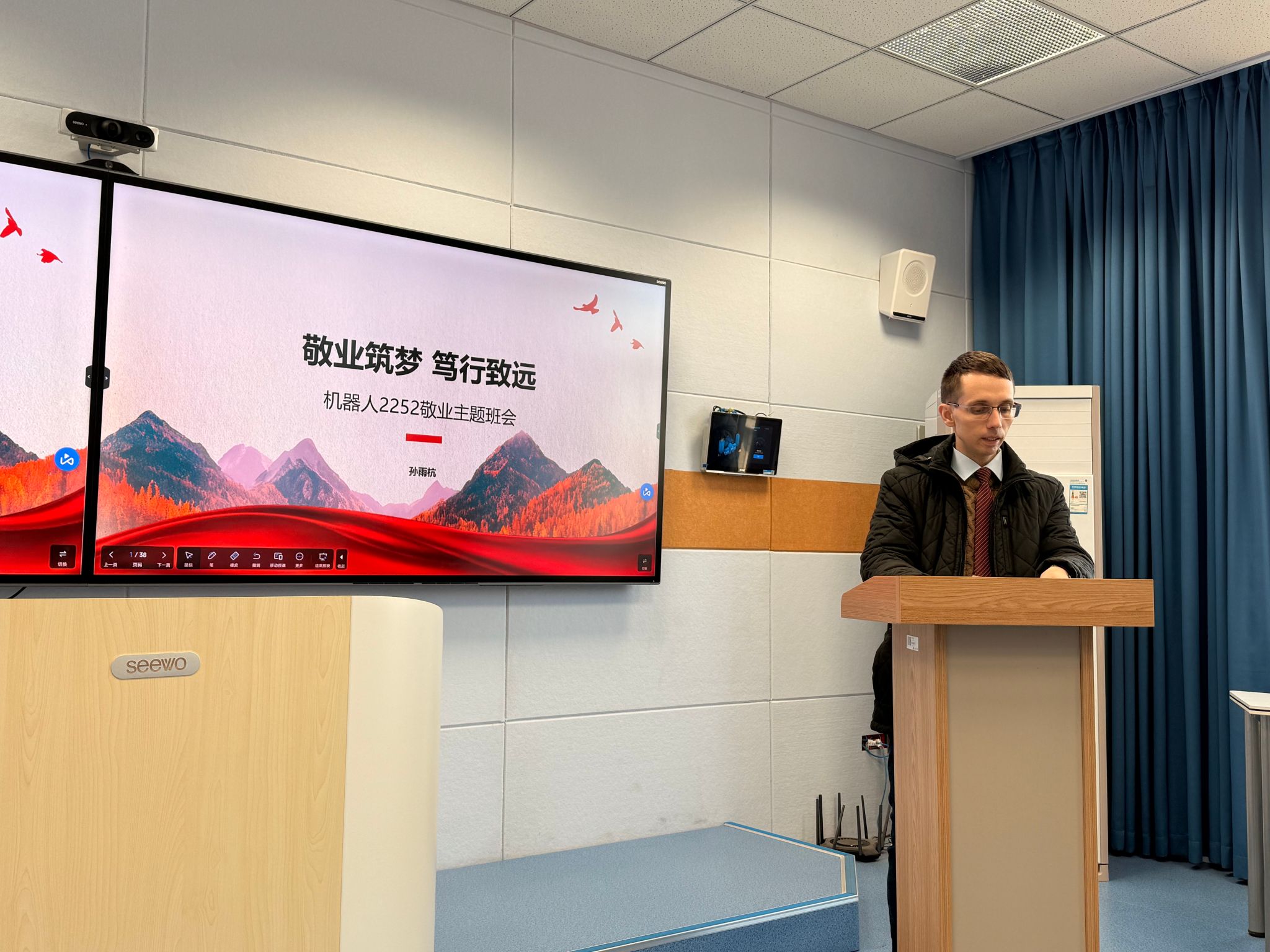 本次评选以“价值引领青春路 逐梦奋进向未来”为核心主题,严格规范评选标准与要求。各参赛班级紧扣社会主义核心价值观丰富内涵,结合海洋工程相关专业特色自主设计班会形式与内容,将主题演讲、情景演绎、心得分享等多元形式融入展示环节,以鲜活的呈现方式让核心价值观教育走深走实。展示过程中,各班学子结合历史脉络诠释爱国情怀,立足专业视角探讨价值践行路径,以身边鲜活事例解读敬业精神,现场互动氛围热烈,充分展现出新时代青年对社会主义核心价值观的深刻理解与坚定践行。活动中,外籍教师GERASIN OLEKSANDR结合自身科研工作经历,以“The Rigor of Reality: Why 1% Off Means 100% Gone”为题,分享了专业领域中坚守“敬业”初心的感悟与心得,为学子们带来了别样的思想启迪。评委团依据“正确导向、紧扣主题、内容丰富、条理清晰、互动流畅”五大评分维度,对各班级的展示进行专业、客观的打分与细致点评。