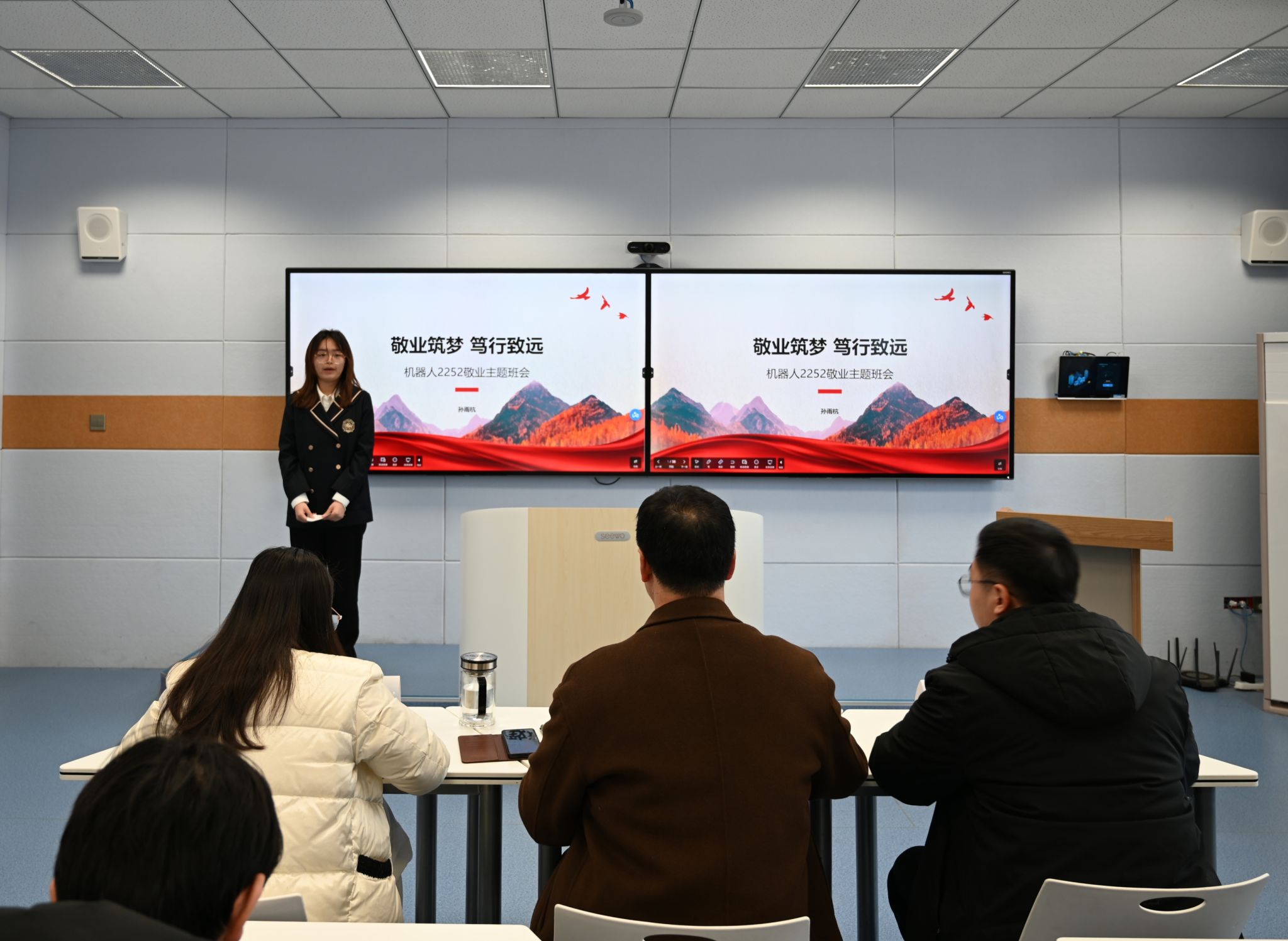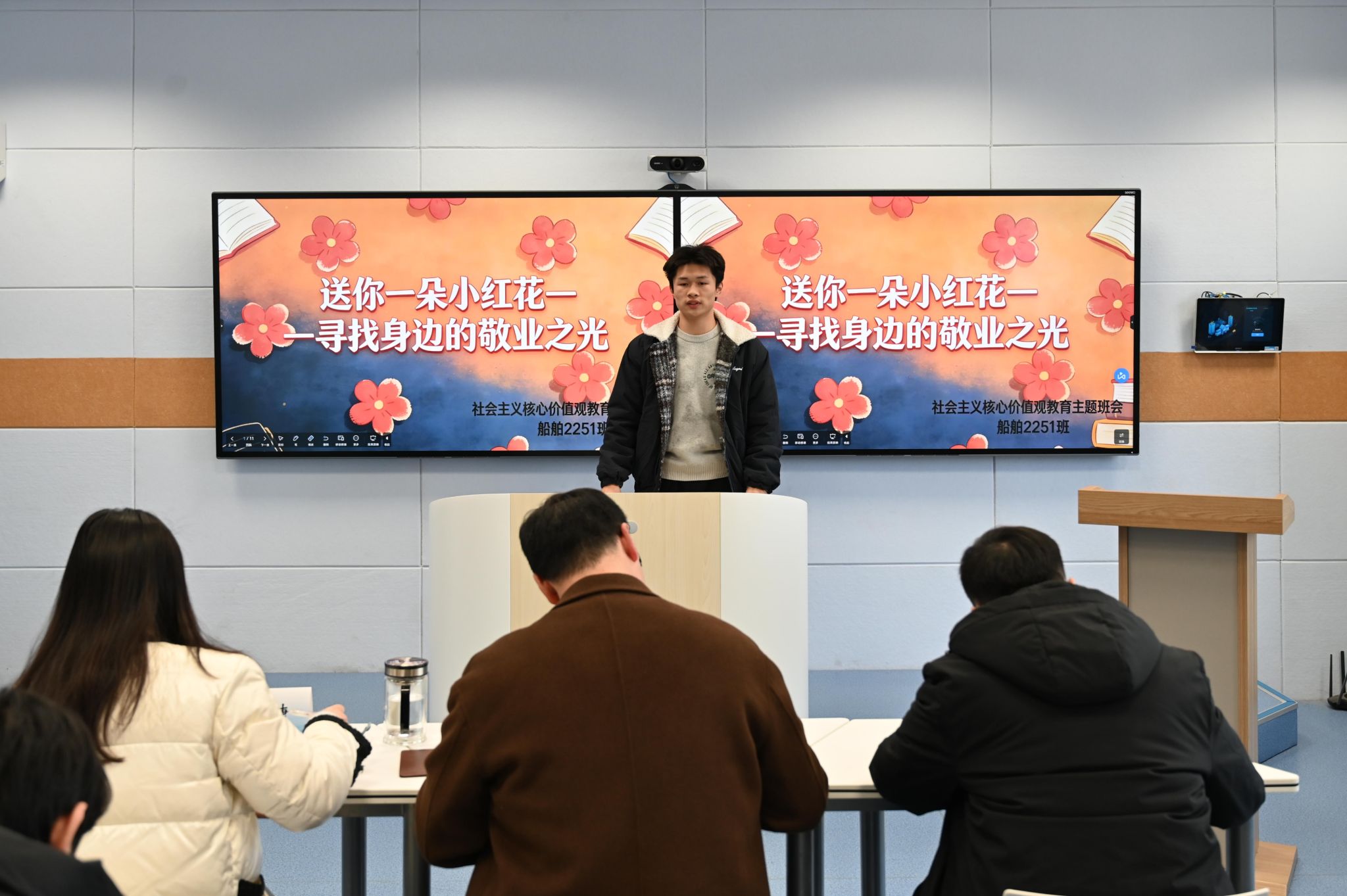 经过激烈的现场角逐,评选结果正式揭晓:船舶2252班凭借精彩的展示斩获一等奖,船舶2251班荣获二等奖,机器人2252班获得三等奖。此次主题班会评选活动,不仅为全院各班搭建了交流学习、展示风采的优质平台,更让社会主义核心价值观在生动的演绎与交流中浸润人心,切实提升了主题班会的育人实效。