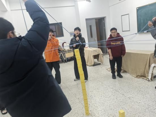 最具挑战性的环节是“合力积塔”游戏。同学们共同操作由绳索连接的钩子,协作堆叠积木块。从最初的操作生疏、屡次失败,到逐步找到节奏、形成合力,大家在一次次尝试中体会到团结协作带来的成就感。每当成功堆起一块积木,现场便响起掌声与欢呼。