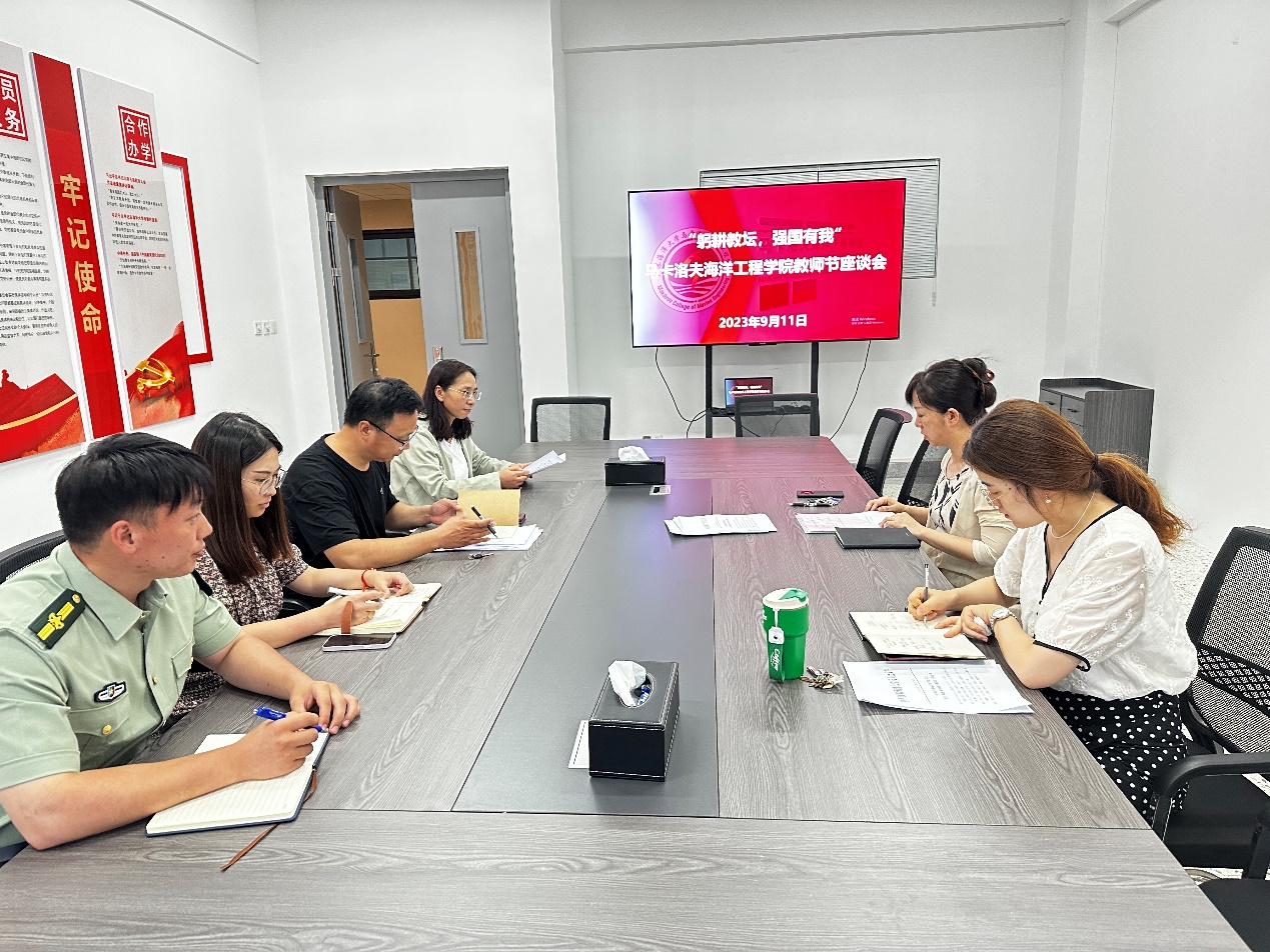 2023年9月11日下午,马卡洛夫海洋工程学院在文华楼会议室召开庆祝第39个教师节座谈会。全体教职工参加座谈会,围绕岗位育人、职业荣誉和学院发展进行深入交流。学院直属党支部书记、常务副院长徐岚参加座谈会并作总结讲话。