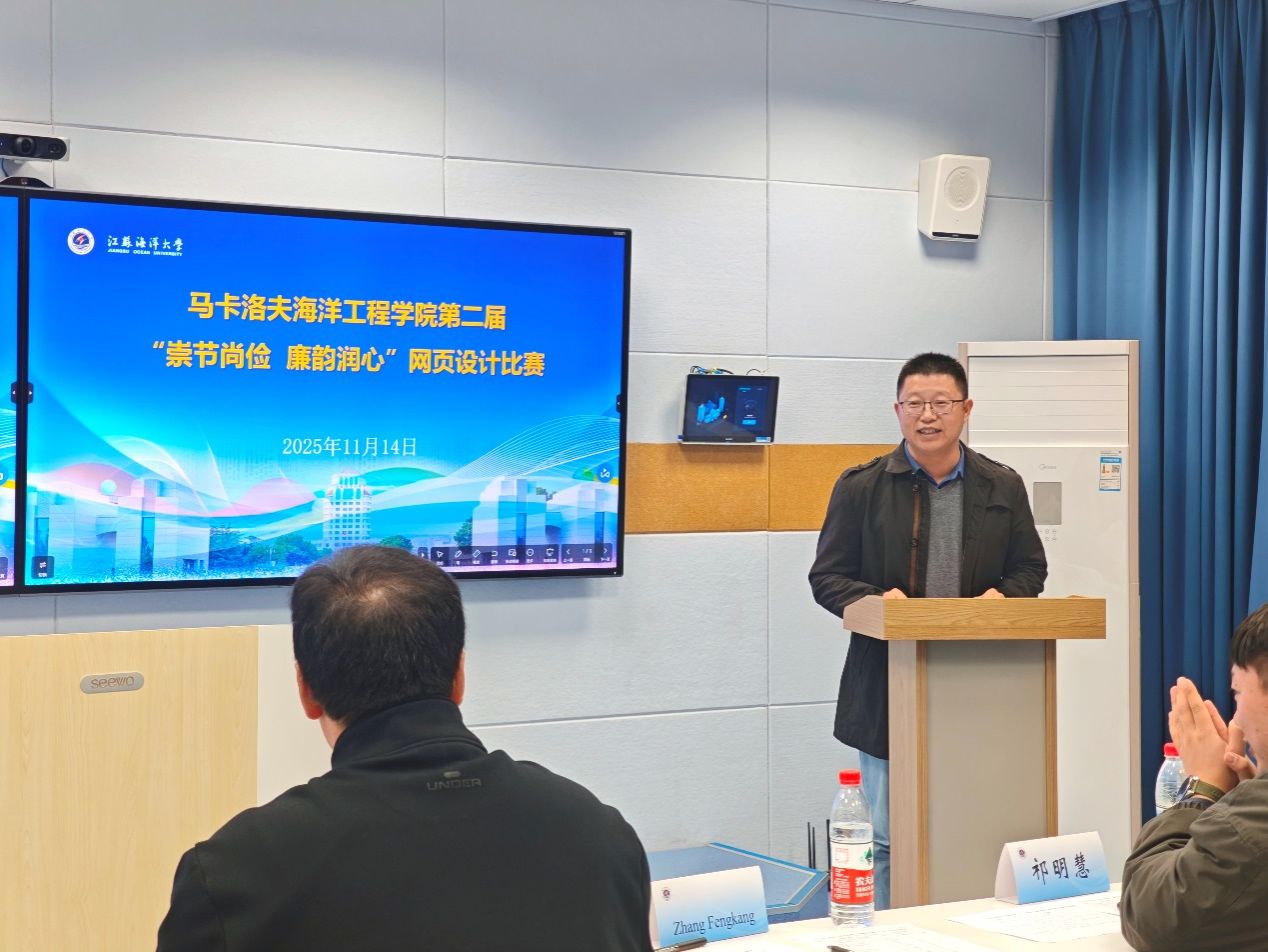 为深入落实学院廉洁文化建设方案,引导青年学子树立正确的价值观、消费观和廉洁观,推动新时代廉洁文化思想入脑入心,11月14日,经过前期系统培训与精心筹备,马卡洛夫海洋工程学院第二届“崇洁尚俭 廉韵润心”主题网页设计现场展示评比活动在文华楼606活动室举行。学院师生党员代表、入党积极分子和研究生代表参加活动。学院直属党支部书记章峰康做活动点评与总结。