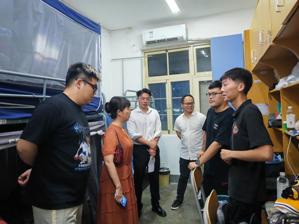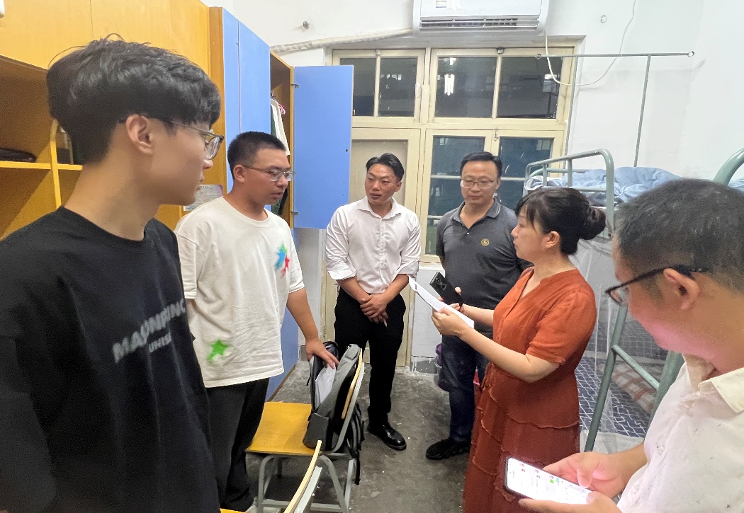 徐岚依次走访每个宿舍,首先亲切的对各位新生的到来表达欢迎,其次询问新生是否能适应宿舍环境,并亲自检查宿舍内部设施是否有故障或损坏,同时也嘱咐宿舍成员要和睦相处,互帮互助,积极向党组织靠拢,一起体验美好大学生活。刘葳兴亲切问候各位女生,勉励她们注重学业,全面发展。李俊伟表示宿舍成员要友好相处,共同提升。解长江勉励新生做好大学四年职业规划,努力提升专业知识水平。徐嘉婕真心关切学生,嘱咐学生好好相处,共同度过大学四年。祁明慧表示同学们如果有生活和学习上的问题可以第一时间联系自己,并叮嘱同学们在日常生活中要注意自身安全,多多参加学校文体活动。