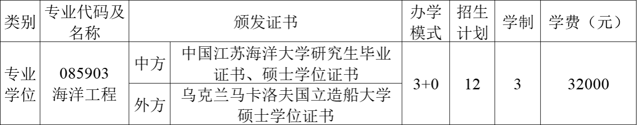 《中外合作办学机构许可证》编号为MOE32UAA02DNR20212175N。海洋工程专业硕士2022年开始招生,首届毕业生升学率25%,高质量就业率41.67%,中乌双学位授予率100%。